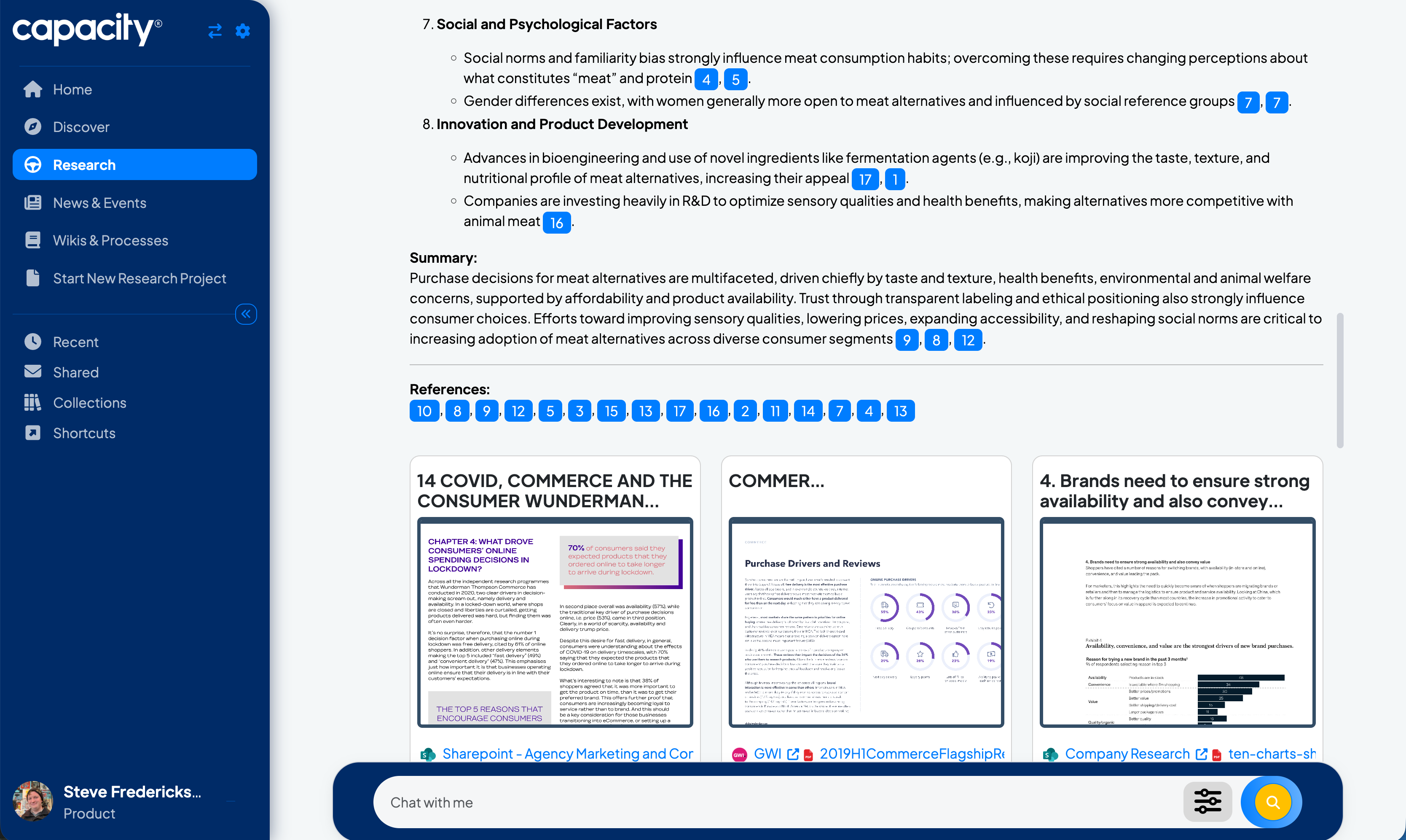 When the system formulates its response, it uses formatting and extensively cites Answers it discovered from across the queries it used for this task. Answers are presented inline as citation chips (i.e. [1]) and below the response as Answer Cards, expanded for easy perusal. Clicking an Answer will open that Answer in fullscreen.